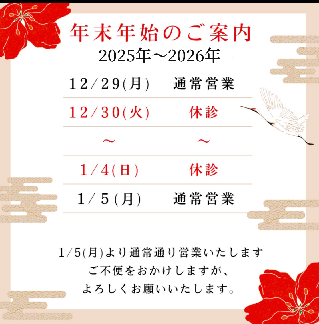 当院は2025年12月30日(火)から2026年1月4日(日)まで休診とさせていただきます。 年始は2026年1月5日(月)より診療を開始します。